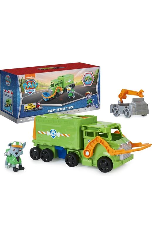 Об’єднайтеся з Роккі для захопливих рятувальних пригод на шосе у його Великій Вантажівці Цуценяті – Рятувальній Вантажівці! Велика рятувальна вантажівка Роккі оснащена захопливою трансформацією. Просто підніміть дах кабіни вантажівки, щоб посадити Роккі на водійське сидіння та вийти з нього. Потім підніміть дах кузова контейнера та опустіть вантажну рампу, щоб перетворити його вантажівку в режим командного центру, та відкрийте його міні-рятувальний автомобіль з іграшковим краном для переробки, що робить його ідеальним рятувальним транспортним засобом для швидкісних рятувальних місій на шосе! З іграшками PAW Patrol дитина може досліджувати свою уяву та розвивати моторику за допомогою уявних ігор, переживаючи улюблені сцени з мультфільму