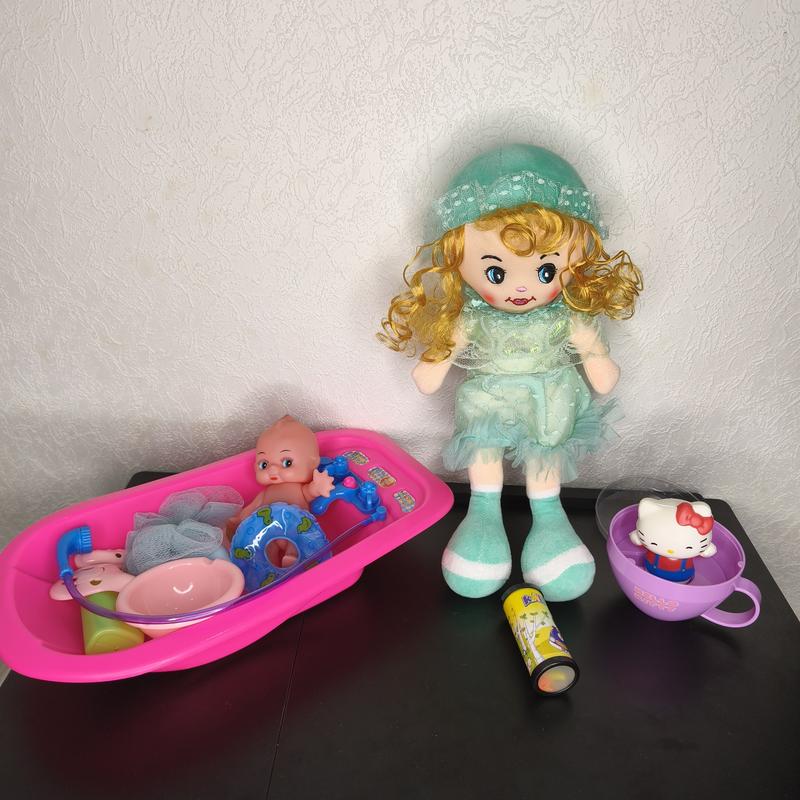 Набір іграшок в ідеальному стані. До набору входить ванночка з пупсом та аксесуарами, іграшка -антистрес в чашці Хеллоу Кітті, калейдоскоп та м'яка іграшка Лялечка. Довжина ванни 36 см. Ширина 20 см. Висота м'якої іграшки Лялька 39 см. Ціна 375 грн. #viktoriya_bendova_tk