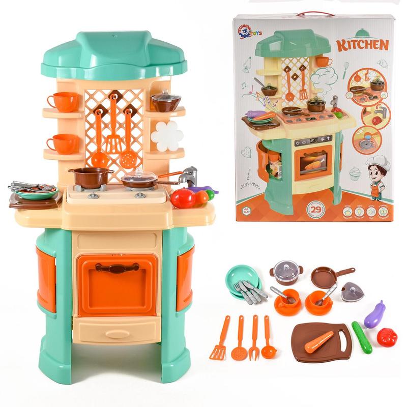 Іграшковий набір "Кухня". Повноцінний кухонний модуль, плита, духовка, полички, продукти, набір посуду та кухонного приладдя. Звукові ефекти. Живлення - батарейки АА (в комплект не входять). Матеріал - пластик. Упаковка - коробка. Розмір - 51х30х81 см.