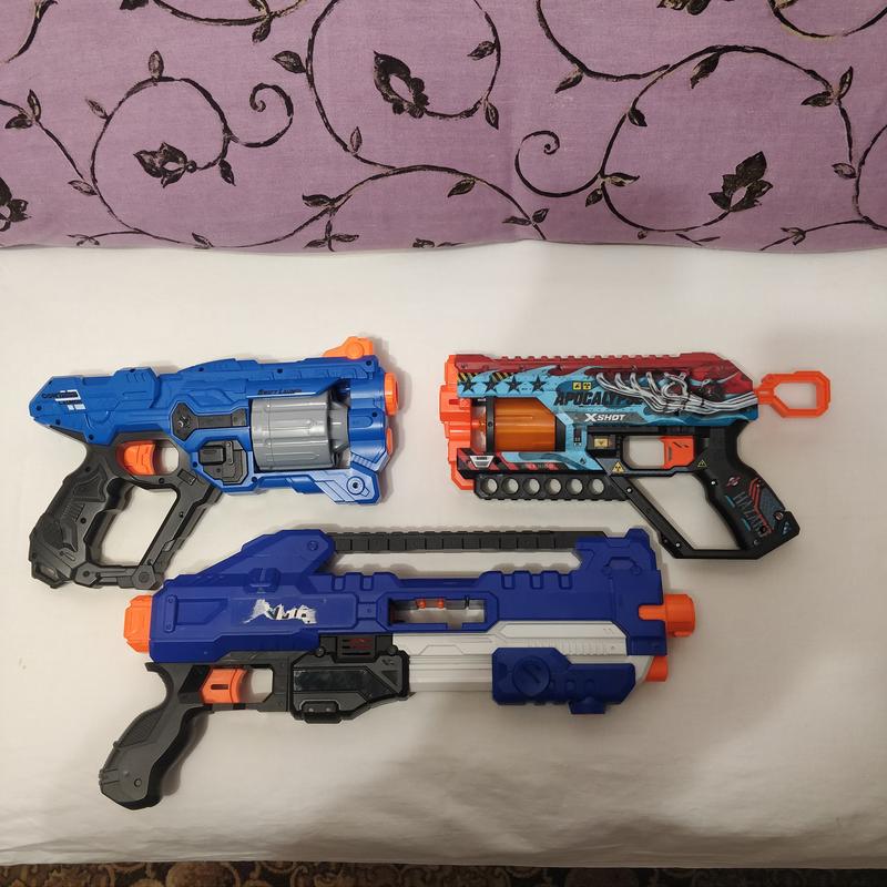 Бластеры в отличном состоянии, только без патронов. Стоимость одного 275 грн. Фото 2: нет Круглый барабан на 6 патронов. Длина 33 см Вес 290 г Фото 3: Круглый барабан на 8 патронов. Длина 31 см Вес 400 г Фото 4: Плоский магазин на 10 патронов. Длина 47 см Вес 500 г