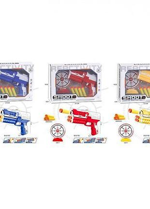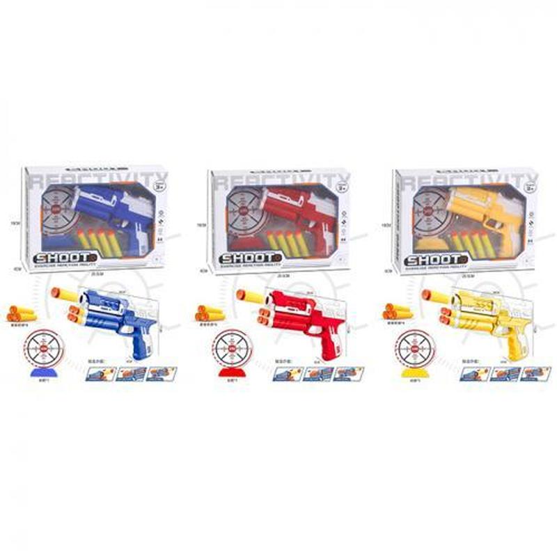 Іграшка "Пістолет", 18 см, 3 кольори. Стріляє кулями-присосками, 4 шт, мішень в наборі. Матеріал - пластик. Паковання — коробка. Розмір - 25,5х6х18 см.
