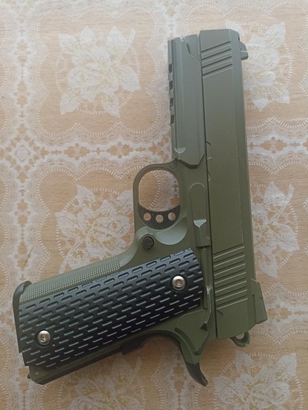 Металевий корпус Швидкість вильоту кулі: 95-99 м/с Легально для самозахисту Вага: 0,795 кг. Магазин: 15 куль Розміри пістолета: 18 х 14 см Пружинно-поршневий механізм В комплекті 150 пуль