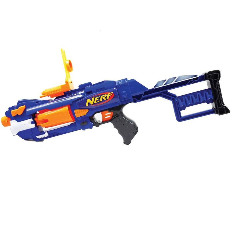 Зброя може вести автоматичну стрільбу й обладнана містким барабаном, у який можна зарядити 7 патронів. У комплекті 2 типи м'яких патронів, 10 на присосках і 10 пластмасовим наконечником. Працює бластер від 3 батарейок типу АА (до комплекту не входять). Дальність пострілу 8-10 метрів. Розмір бластера 55 * 5 * 18 см. Розмір коробки 56 * 6,5 * 22 см.