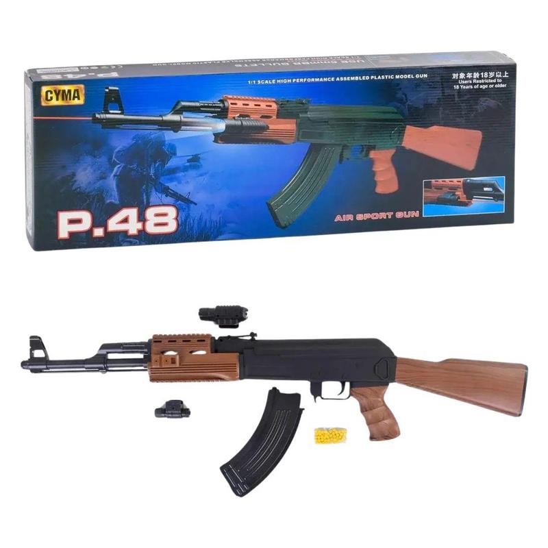 Размеры оружия : 88х25х4,5 см.Комплектация:1 автомат,1 фонарик,1 лазерный прицел,1 магазин,1 набор пулек,Стреляет пластиковыми пулями : 6 мм.