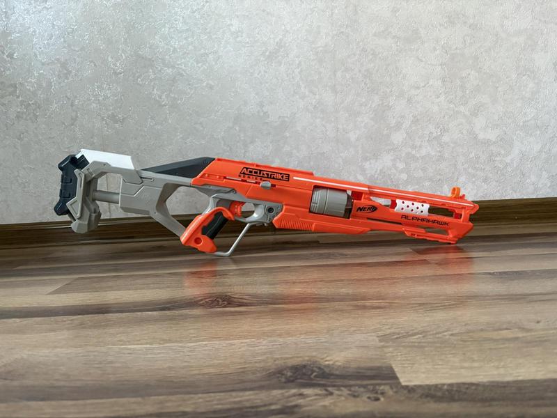 Бластер Hasbro Nerf AccuStrike AlphaHawk N-Strike Elite AccuStrike Series в ідеальному стані без коробки. Nerf Elite Alpha Hawk Hasbro B7784 являє собою бластер із гарними технічними показниками, для хлопчиків від 8 років. Зброя обладнана подовженим дулом і зручним прицілом, що забезпечує гарну точність. Дальність стрільби становить приблизно 20 метрів. Іграшка виготовлена з якісного пластику, що не викликає алергії в дітей. Додатково в подарунок приціл. Пулі не йдуть в комплекті.