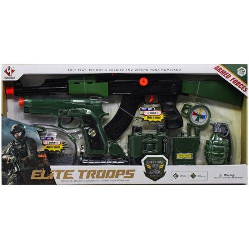 Большой набор с оружием и аксессуарами для увлекательных сюжтно-ролевых игр обязательно впечатлят ребенка. В комплекте есть большой автомат-трещотка (50 см), пистолет, нож, свисток, бинокль, наушники с микрофоном, рация, компас и граната. Все элементы набора выполнены из прочного пластика.