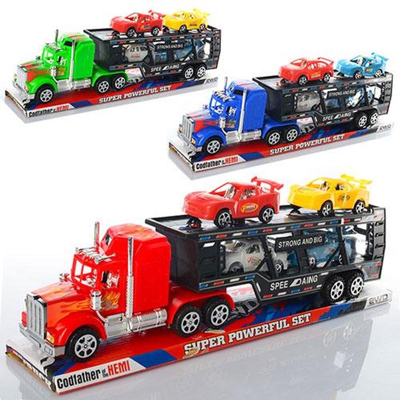 Трейлер 888 3 кольори Трейлер (38 см) + 4 машинки (8 см) Матеріали - пластмаса Паковання в слюді — 39,5*13*8 см Китай
