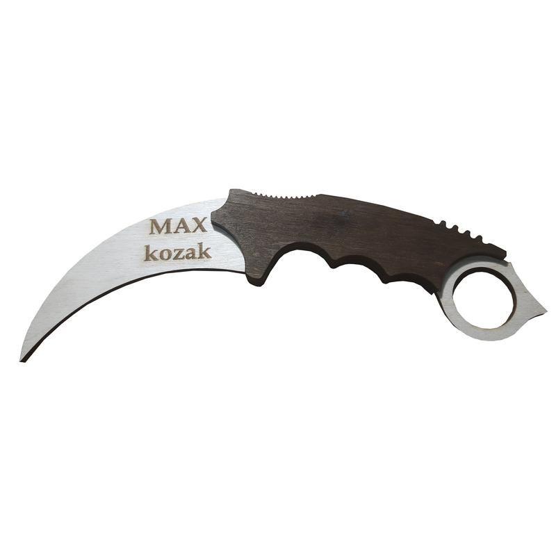 Нож-керамбит Нож в форме когтя тигра. Фанаты будут в восторге от такого подарка. Острые части заокруглены. Цена указана без учета гравировки. Цвет: некрашеная фанера. Размер в мм: 210. Материал: фанера Есть возможность изготовить любой размер и конфигурацию. Заказы принимаются в работу и отправляются по почте при предоплате 100% от стоимости заказа. Оттенок изделия может отличаться от фотографии.