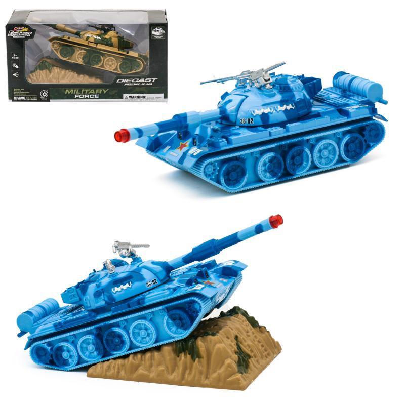 Іграшка "Танк". Світло, звуки, рухомі деталі. Живлення - батарейка. Паковання — коробка. Розмір - 20х6х7,5 см.