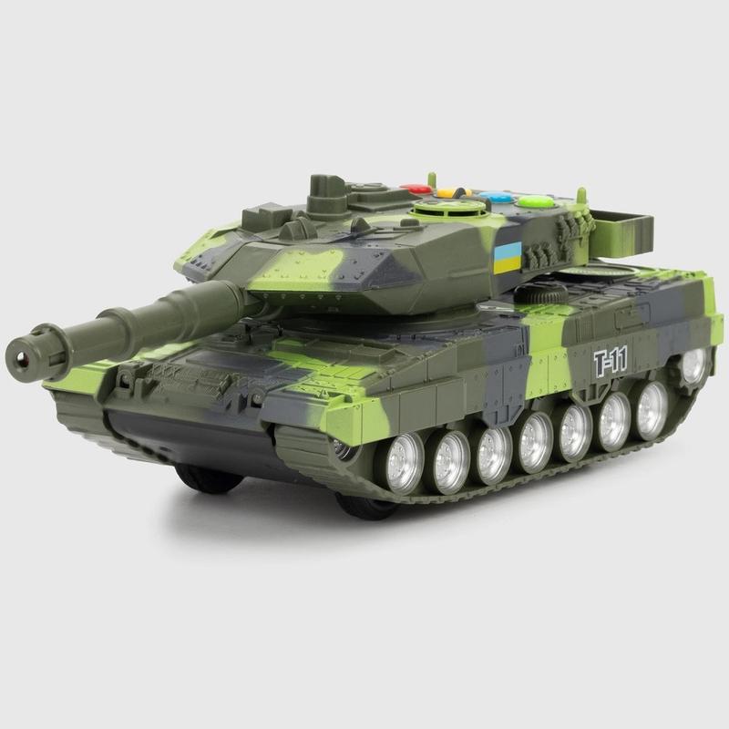 Іграшковий танк від компанії Автопром обов'язково приверне увагу будь-якого хлопчика. У іграшки є звукові та світлові ефекти, які проявляються після натискання 4 різнобарвних кнопок на вежі танка. Рух уперед і назад забезпечують колеса на дні. Танк виготовлений із пластмаси. Дуло підіймається й опускається. Вежа обертається. Розмір танка 28 х 7.5 х 9.5 см. Розмір коробки 31 * 15.5 * 12.5 см.