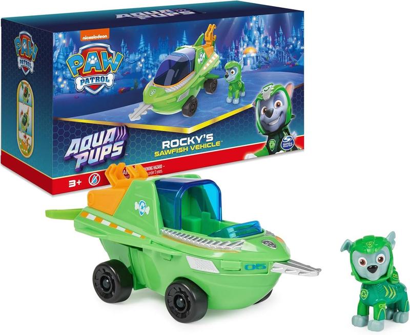 В наявності Офіційне промо - Оглядове TTPM - Новий. Оригінал. За запитом на вайбер підвантажимо весь асортимент по темі - ROCKY ACTION FIGURE: Geared up in his green Aqua Pups wetsuit uniform, complete with helmet and backpack, Rocky is ready for some exciting rescue missions in the pretend sea! - TRANSFORMING TOY VEHICLES: Featuring authentic details and styling, Rocky's Sawfish Rescue Vehicle looks just like it does in the show and quickly transforms into rescue mode! - WORKING RESCUE TOOL: Put Rocky in the cockpit and slide the canopy shut, to engage the wings and dorsal fin! When it's time for a rescue, use the drill tail and Sawfish blade to remove obstacles! - COLLECT THEM ALL: Expand your collection of PAW Patrol toys for girls and boys with toy trucks, action figures, diecast cars, dinosaur toys, stuffed animals, board games, jigsaw puzzles and more! - EDUCATIONAL & LEARNING TOYS: PAW Patrol preschool toys and toddler toys are great gifts for kids who like pretend play with toy cars, toy figures & playsets as an alternative to dolls or a train set - Includes: 1 Rescue Vehicle, 1 Rocky Figure - Covered by the Spin Master Care Commitment. See below for full details Product Description Team up with Rocky, for some action packed rescue missions, in his Aqua Pups - Sawfish Rescue Vehicle! Suited in his green Aqua Pups wetsuit and helmet, Rocky is ready for supercharged rescues in the pretend sea! Rocky's Sawfish Vehicle features an exciting transformation! Simply place Rocky in the vehicle cockpit and slide the canopy shut, to engage the wing and dorsal fin, transforming his vehicle into rescue mode! When there's trouble, quickly transform into rescue mode and speed off to the rescue, then use the articulated claw tail and Sawfish blade to clear away any obstacles! Create PAWsome adventures with Rocky's Sawfish Rescue Vehicle! Then, for even more exciting series-inspired missions, collect all the Aqua Pups figures and toy vehicles, (sold separately) for endless hours of action-packed adventures! With PAW Patrol toys, kids can explore their imaginations and develop their motor skills, through pretend play, as they bring their favorite scenes from the show to life! PAW Patrol action figures, toy cars, playsets and stuffed animals are the perfect toys for boys and girls aged 3 and up, so bring home the excitement of the PAW Patrol: Aqua Pups! Important information * * * From the brand * * * From the manufacturer PAW Patrol: Aqua Pups Rocky's Transforming Sawfish Vehicle Get ready for endless adventures on the pretend seas with the PAW Patrol Aqua Pups! Dressed in his green aqua pups wetsuit and helmet, Rocky can't wait to race to the rescue in his all new Sawfish Rescue Vehicle! When there's trouble, place Rocky in the cockpit of his transforming Sawfish Vehicle and close the canopy, to shift into rescue-mode! Extend the articulated drill then use the Sawfish blade to clear away any obstacles. Collect all of the PAW Patrol Aqua Pups and their transforming vehicles (each sold separately) and relive your favorite rescue moments from the show! Includes: - 1 Rescue Vehicle - 1 Rocky Figure Aqua Pups Action Figure! Wearing his green Aqua Pups wetsuit uniform, complete with helmet and backpack, Rocky looks just like he does in the show and is ready for action packed rescue adventures on the pretend seas. Vehicle Transformation! Put Rocky in the cockpit of his Sawfish vehicle and close the canopy, to activate an exciting transformation into rescue mode, before racing off on another exciting rescue mission. Articulated Rescue Tool! When it's time for an action packed rescue, transform into rescue mode and use the articulated drill and saw blade to clear away obstacles and save the day!