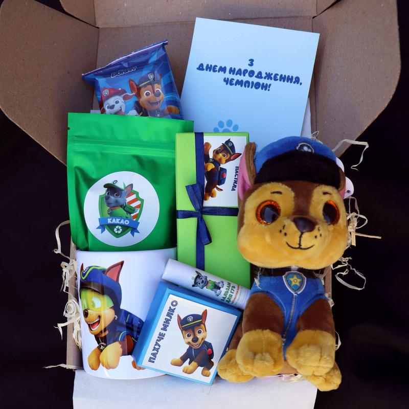 Це просто ідеальний подарунок для дитини. Склад набору: - плюшева іграшка 8*15см "Chase" (3+ років) 15 см*8см (виробник TY) - керамічна чашка з принтом, 340мл (наше виробництво) - натуральний бальзам для губ, 5мл (наша ручна робота) - мило-кубик з ароматом кокосу, 90г (наша ручна робота) - дитячі вологі серветки "Paw Patrol" - какао, 100г - цукерки-пастилу "Равлик Боб" - листівка та святкова упаковка