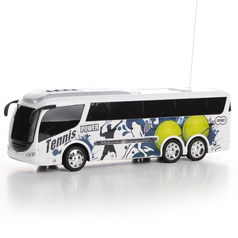 Автобус теніс на дистанційному керуванні з серії, що присвячена спортивній тематиці. На ньому зображені тенісисти і тенісні м'ячі. Малюк може стати водієм спортивного автобуса і перевозити спортсменів з однієї гри на іншу або відправитися з ними в далеку подорож, наприклад, на чемпіонат світу чи Європи. Для того щоб гра почалася, необхідно натиснути на кнопки включення на пульті керування і на автобусі. Керувати автобусом можна за допомогою пульта дистанційного керування, який, як і автобус, працює від батарейок (не входять в комплект). Він може їздити в різні боки, повертаючи праворуч і ліворуч, може розганятися і гальмувати. Автобус оснащений нічним підсвічуванням передніх фар і бічних сторін, може сигналити і видавати музичні звуки. Гра з такою іграшкою захопить малюка, ви не пошкодуєте про таке придбання. За допомогою автобуса ви можете подорожувати по квартирі, вивчаючи незвідані її куточки. Іграшка допомагає розвивати логічне мислення, пам'ять, уяву, фантазію, координацію. Автобус виготовлений з якісного пластику, безпечного для здоров'я дитини. Під час вибору іграшки на дистанційному керуванні звертайте увагу на її частоту управління, дуже важливо, щоб вона не збігалася з частотою інших машин. Дана модель працює на частоті 40 MHz. Автобус призначений для дітей від 6 років. Комплектація: автобус – 1 шт.; пульт управління – 1 шт. Тип живлення: AA-6шт
