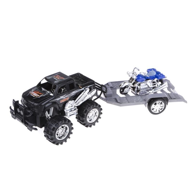 Позашляховик-евакуатор з величезними колесами і причепом, на якому знаходиться мотоцикл. Завдяки тому, що мотоцикл знімається і може використовуватися окремо від позашляховика, виходить відразу дві іграшки. На причіп же можна помістити будь-який вантаж або пасажирів і влаштовувати ралі по пересіченій місцевості. Мотоцикл прекрасно співвідноситься з іншими машинками, підходить для швидкісних перегонів. Загалом, завдяки такій іграшці, фантазії буде, де розгулятися. Транспорт – улюблені всіма іграшки, які підійдуть навіть для маленьких дітей. З їх допомогою розвивається уява і відбувається навчання сюжетно-рольовим іграм. Тип живлення: LR44-3шт