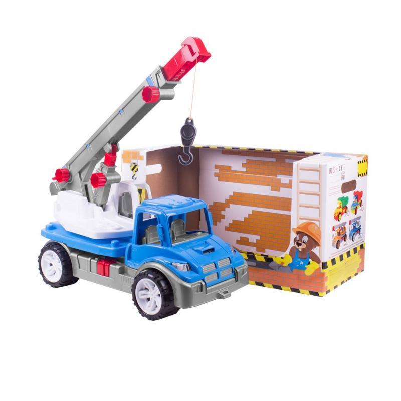 Іграшка "Автокран Атлант". Рухомв платформа, висувна стріла, великі колеса. Матеріал - пластик. Паковання — коробка. Розмір - 57х27х30 см.