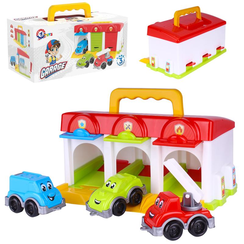 Іграшка "Гараж". Комплектація - бокси з важелем-катапультою, 3 автомобілі, заправні станції. Матеріал - пластик. Паковання — коробка. Розмір - 27,5х14,5х14 см. ВІк - від 3 років.