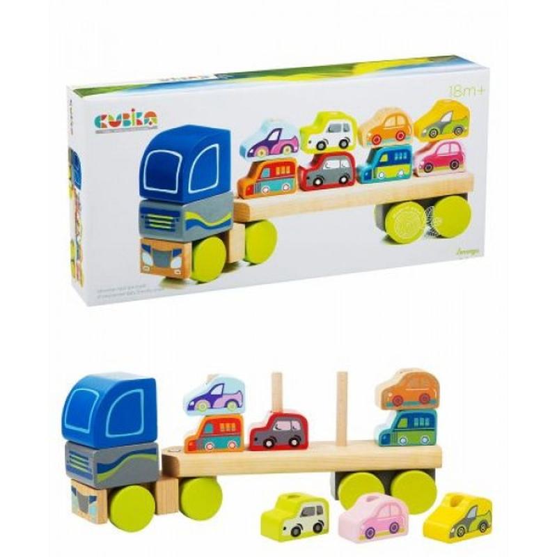 Яскрава різнобарвна машинка тягач із дерев'яною основою та колесами. Поверхня іграшки добре відшліфована, не має гострих краєм. У машинки крутні колеса. Складається з 12 елементів.