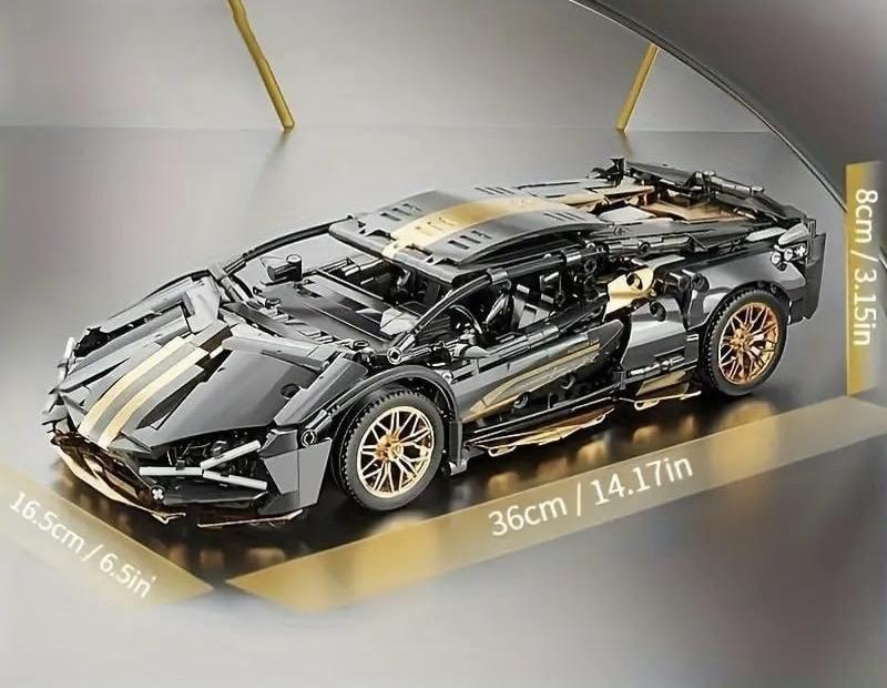 🏎Конструктор автомобіля з технічними деталями, що нагадує спортивний автомобіль класу люкс. 🧩Модель має розміри: 36 см в довжину, 16,5 см в ширину та 8 см у висоту. 🖤Дизайн включає чорний корпус із золотими смужками та золотистими дисками коліс, що надають їй елегантний вигляд. ✅Ідеально підходить для фанатів технічних конструкторів та автомобілів.