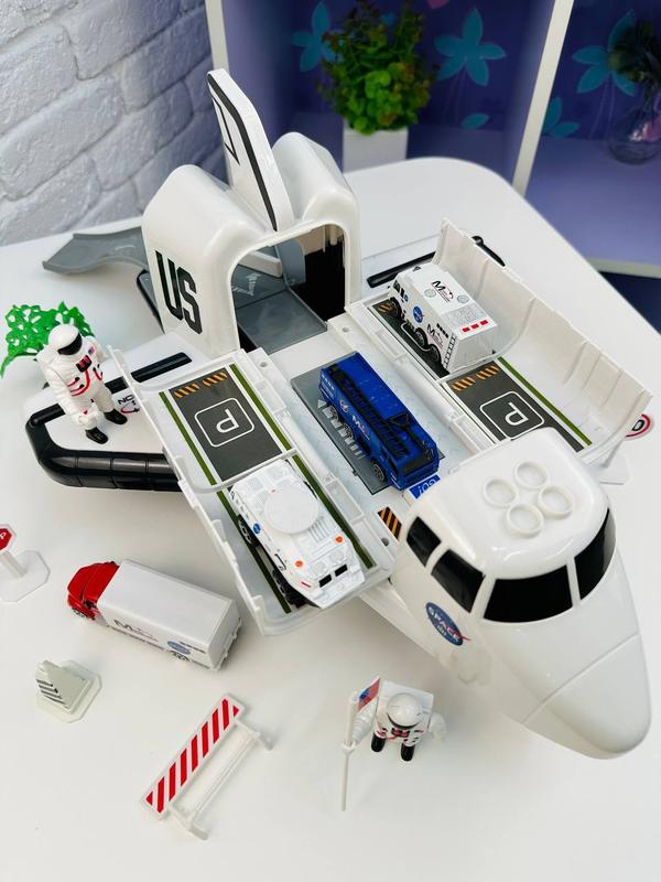 Великий набір "Космічний шатл-парковка" 🅿️✨ стане ідеальним подарунком для маленьких мрійників! Усередині шатла зберігаються машинки 🚙🚗 та два справжні астронавти 🧑🚀👩🚀. Комплектація (20 деталей): 4 машинки 🚅 різного типу. 2 фігурки астронавтів. Набір дорожніх знаків 🚧🚏. Особливості: Машинки пересуваються всередині шатла та виїжджають спеціальним трапом 🛝 з хвостової частини. Космічний шатл обладнаний інерційним механізмом 🏎️ для захопливої гри. 📐 Розмір шатла: 37 см. 📦 Розмір коробки: 42х30х14 см. Доставка накладним платежем або повна оплата.