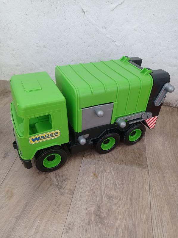Мусоровоз использовали только в квартире. Размеры мусоровоза: длина - 42 см, ширина - 18 см, высота - 22 см. Функциональность мусоровоза:: бак поднимается для легкой выгрузки содержимого; сбоку есть открывающееся ревизионное окно; в комплект входит мусорный бак, который устанавливается сзади фургона на направляющие и с помощью рычага опрокидывает в него содержимое. При этом крышка маленького бака открывается сама.
