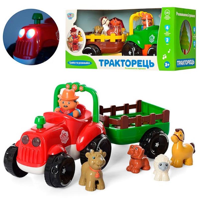 Озвучено українською мовою🇺🇦 2 кольори: Червоний🔴 Зелений🟢 Музичний🎼 тракторець🚜 везе за собою причеп, у якому сидить 4 тваринки: вівця🐑 корова🐄 кінь🐎 і собачка🐕 Під час їзди трактор співає веселу пісеньку🎵 а також розказує віршик про кожну тваринку. Неймовірна подорож доповнюється яскравим підсвічуванням фар💡 та звуковими ефектами🔊 це додає ще більше вражень до гри. 🔋Працює від 3 батарейок АА (в комплект не входять). 📐Розмір: 36см Матеріал : Виробник : -