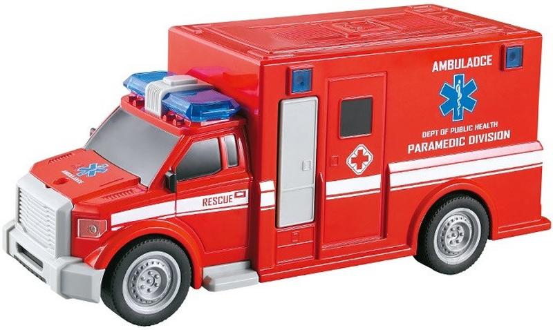 Інерційна Швидка допомога в зручному масштабі 1:20. У машинки з допомогою кнопки на даху кабіни вмикається світло, звук. Машинка працює на фрикційної котушці — навіть з одного легкого поштовху модель набирає хорошу швидкість, тримає відмінне зчеплення з дорогою. Гумові покришки міцно встановлені на колесах, щоб малюк не зміг їх зняти. Машинка виготовлена з пластика, відмінно деталізована і ретельно промальована. Розмір коробки 24 * 11 * 16 див.