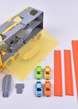 Автовоз із треком — це цілий ігровий набір на колесах! З ним вам буде доступно безліч варіантів гри. Іграшка являє собою набір із моделі автовозу та легкових машинок з інерційним механізмом руху. Бічна стінка кузова відкидається. У кузові можна обладнати трек, яким можуть їхати машинки. Під час натискання кнопочок на даху автовоза почушуться автомобільні звуки, що супроводжуються мерехтливою підсвіткою. Світлові та звукові ефекти працюють від 3 батарейок типу AG13 входять до комплекту. У комплекті: вантажівка автовоз, 4 машинки з інерційним механізмом руху, 7 деталей для складання траси у формі мертвих петлі Розмір машинок 8 * 3 * 2 см. Розмір вантажівки 51 * 11 * 17 см. Розмір коробки 55 * 12 * 21 см.