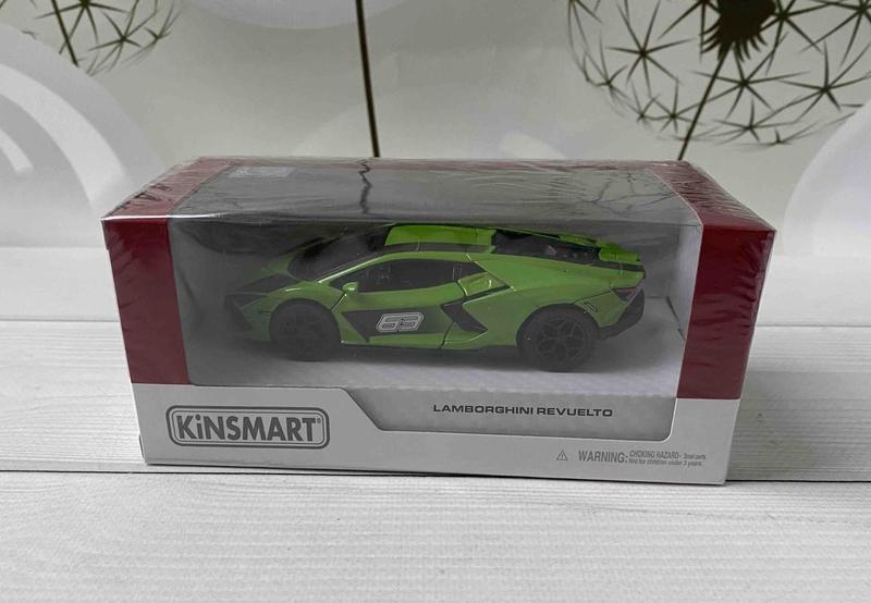 Машинка Lamborghini Revuelto ( Kinsmart) Характеристика: Матеріали: метал+ пластик Відкривні дверцята Розкішний зелений колір Реалістичні деталі кузова та салону