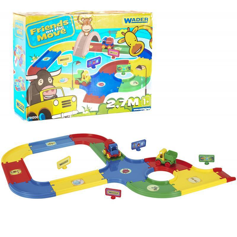 Этот чудесный автотрэк подойдёт даже для самых маленьких! Игрушка представляет собой конструктор с разноцветными деталями для сбора трассы. Прямые и поворотные блоки соединяются между собой с помощью системы click-click, что обеспечивает огромное количество вариантов сборки дороги. Также в комплект входят 2 машинки и дорожные знаки. • Протяжённость трассы: 2.7 м; • Материал: пластик; • Для детей от 1 года