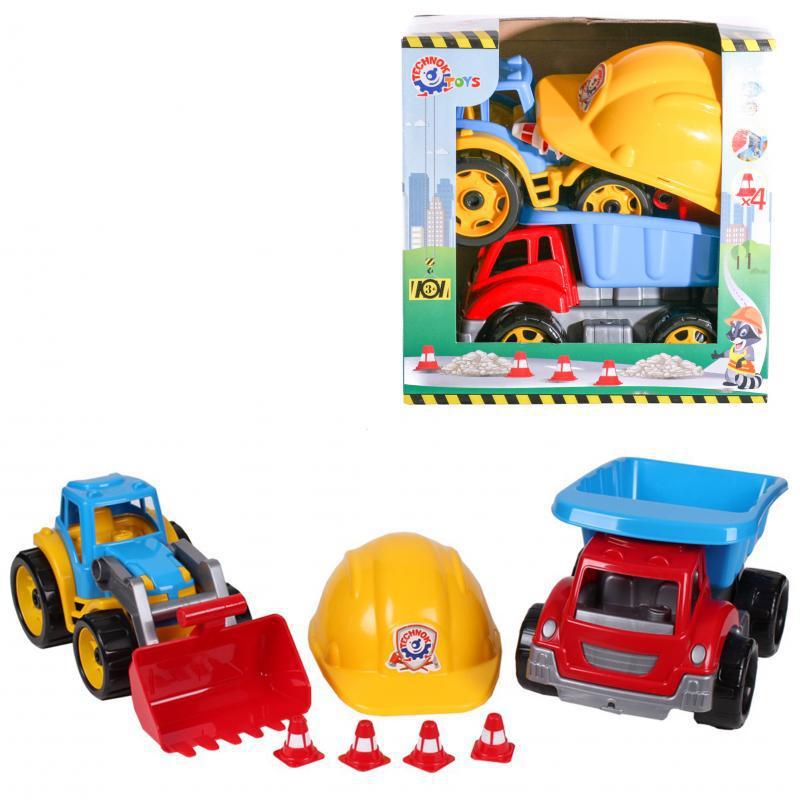 Чудовий ігровий набір відмінно підійде для захоплюючих дитячих ігор. Дитина зможе уявити себе будівельником, який зводить високі будинки, школи та лікарні. В комплект входять самоскид, трактор з ковшем, 4 двоколірні дорожні конуси та будівельна каска. Яскрава напіввідчинені коробка дозволяє бачити комплектність іграшки і робить її водночас гарним подарунком. Іграшка виготовлена з нешкідливих полімерних матеріалів. Вік дитини: від 3 років