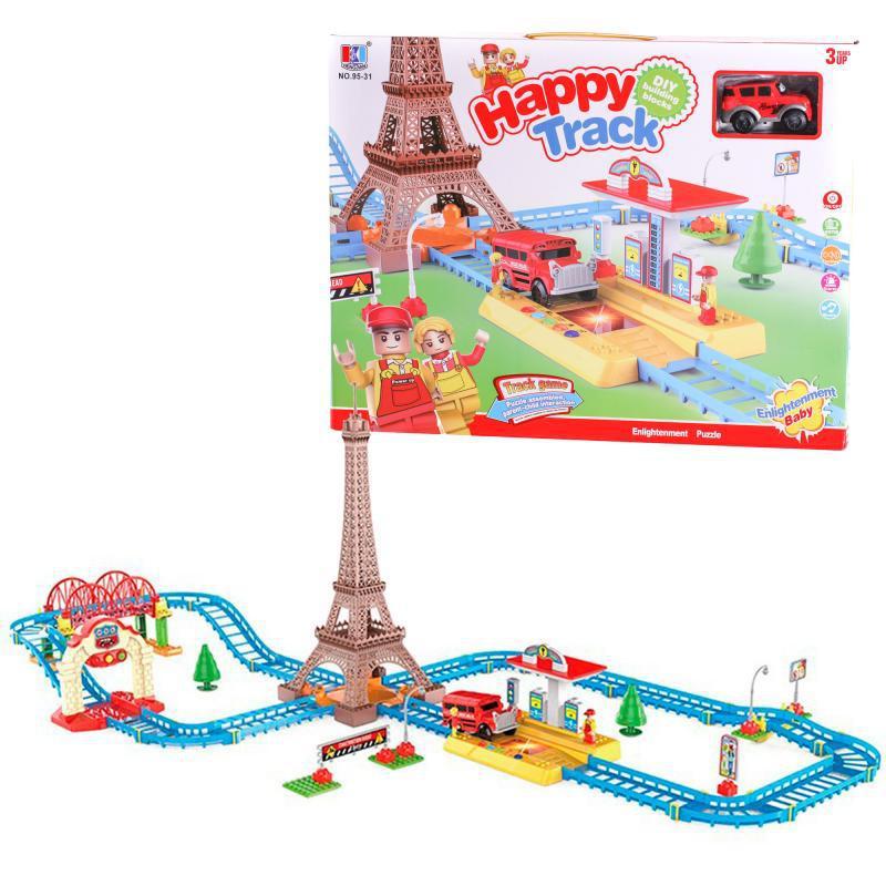 Цей трек натхненний атмосферою великого міста. АЗС, міст і неперевершена Ейфелева вежа зроблять гру особливо захоплюючою! Характеристики: • Матеріал: пластик; • 99 деталей; • Розмір треку: 118х72 см; • Світлові та звукові ефекти; • Живлення від батарейок Комплектація: • Деталі треку; • Машинка (9 см); • Міст; • Башта; • АЗС; • Елементи пейзажу і дорожні знаки