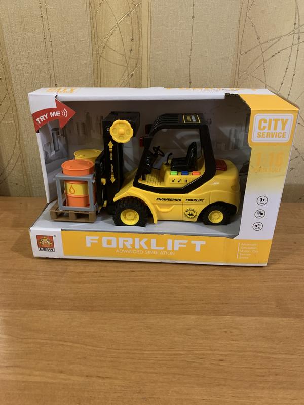 Машина погрузчик. Функциональная, инерционная, прекрасно детализированная модель машины- погрузчика. Имеет фрикционный механизм. Механический подъём стрелы вверх - вниз. У водительского кресла 3 кнопки: звук двигателя, сигнал, звук заднего хода. Изготовлена из прочного пластика. Масштаб: 1:16 Размер машины: 23*9*13 см. Размер упаковки: 28*11.5*18.5 см. Игрушка новая.