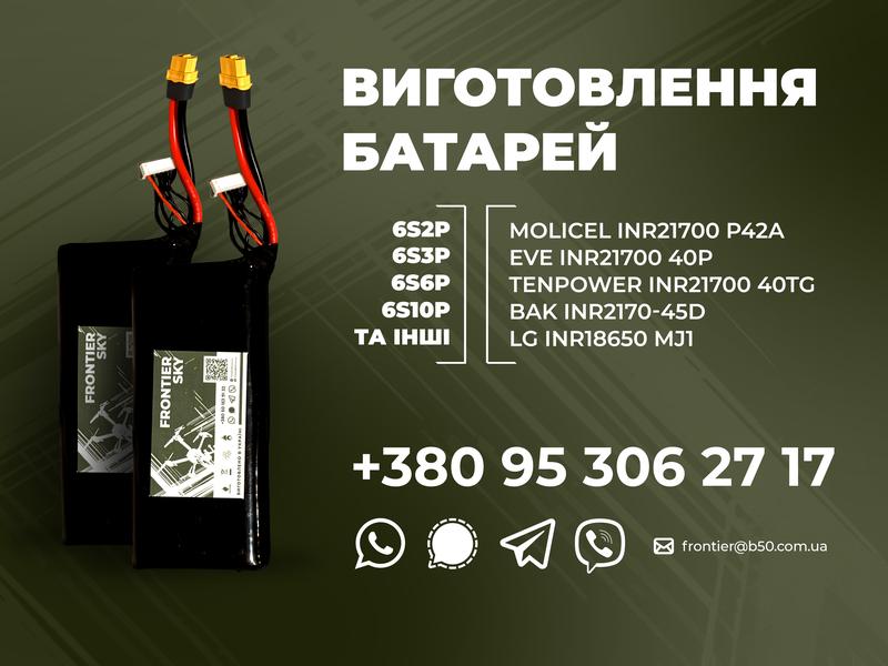 Аккумуляторные батареи в наличии на складе: 6s2p Molicell P42A 8400 mAh ...........2850 грн 6s2p Tenpower 40TG 8000 mAh ......2250 грн 6s2p EVE 40P 8000mAh................2250 грн 6s3p Molicell P42A 12600 mAh .........3950 грн Также возможно изготовление различных сборников по заказу. У нас есть большой опыт изготовления аккумуляторных батарей, которые используются на различных изделиях, включая FPV дроны, специальное оборудование, разведывательные крылья.