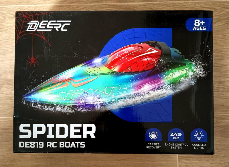 Амазон товар з Німеччиною.DEERC Spider DE819 RC Boats. Це високошвидкісний гоночний човен, призначений для використання на воді. Він оснащений системою керування 2.4 ГГц і має функцію самовідновлення у разі перекидання. Човен також має світлодіодні ліхтарі. Рекомендований вік для використання — 8+ років.