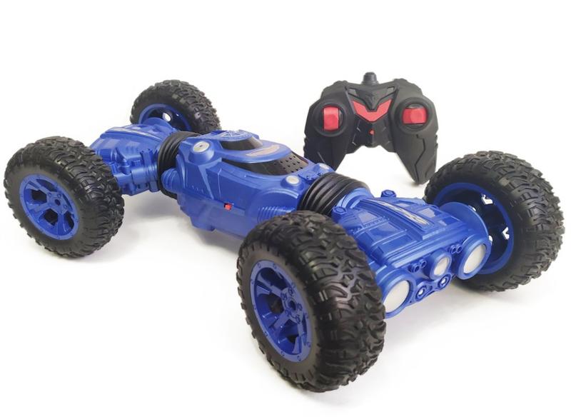 Синяя трюковая машинка умеющая сгибаться и разгибаться при нажатии центральной кнопки. Благодаря такой функции машинка отлично подойдёт для бездорожья, также она умеет ездить вверх ногами. В комплекте с радиоуправляемым внедорожником также предоставлена зарядка и аккумулятор. Длина машинки 37 см.