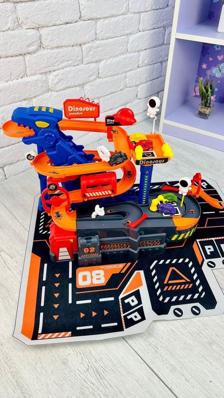 ТРЕК ДИНОЗАВР Открывая свои челюсти с острыми клыками, доисторический монстр запускает маленькие машинки - 42 елементи - автоматический подъемник - тунелі - воспроизведение звуковых эффектов и мелодии - 5 машинок - фетровый игровой коврик - стартовый запускник в виде головы динозавра - декоративные элементы в стиле космической станции Работает от 3-х батареек АА (не прилагаются) Размер: 59,7х33х33 см Цена: 1050 грн
