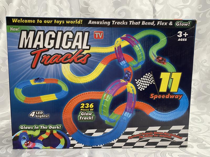 Меджік трек, новий, запакований, на 236 деталей і з машинкою в комплекті, дорога складається із силікованих пластин, які гарно гнуться, можна будувати із них гірки, підйоми і спуски. Буде гарною розвиваючою іграшкою як для хлопчиків так і для дівчаток. Машинка підсвічує дорогу, найліпше спостерігати як машинка їде у темній кімнаті. Машинка їде на батарейку 3А.
