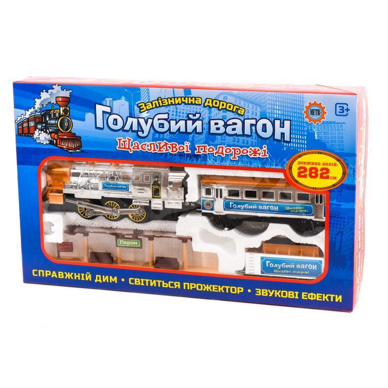 Залізнична колія "Голубий Вагон". Озвучення на українській мові. Довжина колії - 282 см. Є звукові ефекти, світяться прожектори. Живлення - батарейки. Матеріал - пластик. Паковання — коробка. Розмір - 48х7х30 см.