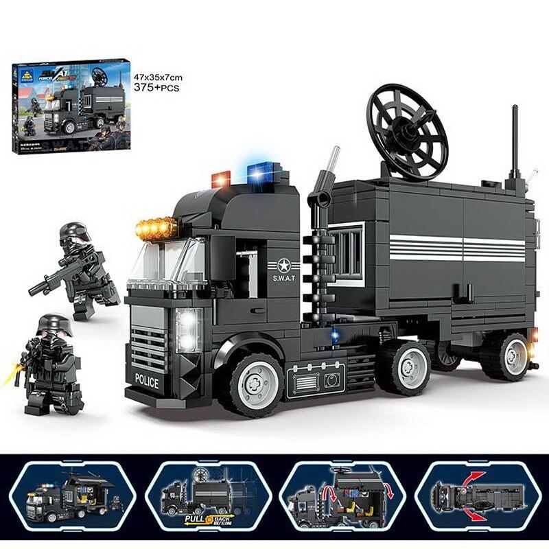 Сучасний та неймовірно цікавий конструктор серії "SWAT Force" демонструє будні поліцейських, які щодня стоять на варті правопорядку та спокою міста. Завдяки поліцейській мобільній радіолокаційній станції вони можуть впоратися з будь-яким завданням і подолати небезпеку, що нависла над городянами. - машина пофарбована у чорний колір із написом "Поліція"; - конструктор включає 2 фігурки поліцейських, оснащених захисними щитами та зброєю; - Гумові колеса; - Машинка оснащена інерційним механізмом; - Відчиняються двері; - вантажна машина обладнана локатором та спеціальною шпигунською технікою. -Кількість деталей 375+ -тип кріплення пазовий