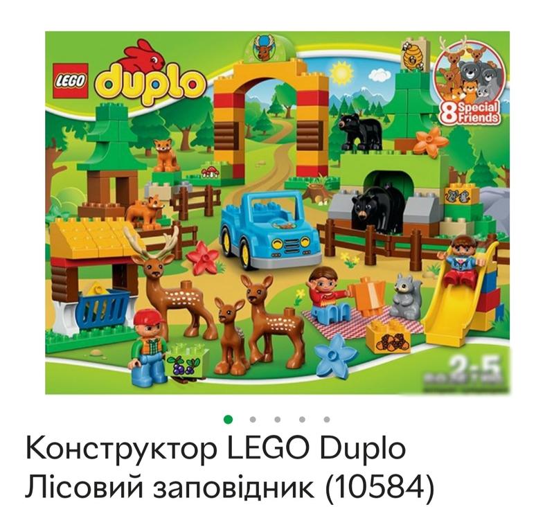 Конструктор LEGO Duplo Лісовий заповідник (10584) Кількість деталей 105. Кубики LEGO DUPLO допоможуть розбудити у вашій дитини цікавість до навчальних ігор. Ваша дитина може будувати, творити та розвиватися, оскільки для цього є стільки різноманітних можливостей. Кубики DUPLO сумісні з кубиками LEGO, тому дитина зможе використовувати свої улюблені деталі й в інших наборах LEGO. Лісовий заповідник дає прекрасну можливість поспостерігати за дикими тваринами, а також дізнатися якомога більше про їхній спосіб життя і звички. У наборі LEGO 10584 Ви знайдете безліч фігурок: доглядач зоопарку, мама, дівчинка, 2 лисиці, 3 олені, 2 ведмеді й білочка, а також аксесуари, як-от: автомобіль доглядача заповідника, емблема заповідника, гірка, годівниця, вила, сіно, чайник, скатертина та квіти. Для реалістичної й пізнавальної гри можна використовувати спеціальні кубики із зображеннями лісових горіхів, ягід, мухоморів, бджолиного вулика та мишей. Підходить для дітей віком від 2 до 5 років. ❗Без коробки.