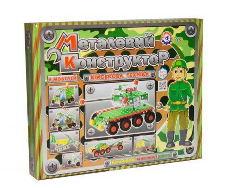 дитячий металевий дитячий конструктор "Воєна техніка". 201 деталь у комплекті (гвинтики, планки, гайки, вилки, кермо, колеса, ключі, викрутка та ін.). 8 різних моделей для збирання, інструкція.