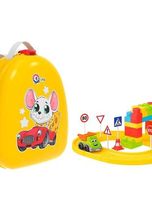 Набор с конструктором в пластиковом рюкзачке. В комплекте 38 деталей, из которых можно собрать яркий трек для машинки. В наборе есть множество декоративных элементов в виде различных дорожных знаков. Выполено из прочного и безопасного пластика. Для детей от 3-х лет._ Бренд: Технок Упаковка: Без упаковки Цвет: Желтый Вес в упаковке: 630 г Габариты в упаковке: 11 x 25 x 21 см Габариты без упаковки: 11 x 25 x 21 см Cтрана производитель: Украина Материал: пластик Комплектация: Рюкзак, 38 деталей