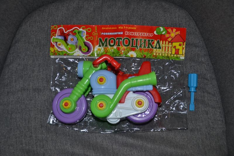 Якісна іграшка конструктор-мотоцикл з викруткою, пластик, виробн. Україна, для дітей від 3 років. Зібраний може їздити, розбирається пальчиками або викруткою. Якісний пластик, витримує удари/падіння. Розміри: 22*13*11см. Стан дуже хороший, все ціле, працює, сліди використання незначні. Доставка: Нова пошта, Укрпошта, Meest. Оплата: 100% передплата на картку Приват/Моно Опис та фото роблю чесно, уточнюйте деталі до покупки, обміну немає, повернення лише у разі неописаного браку.