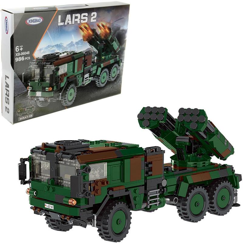 Конструктор Xingbao Німецька самохідна РСЗО LARS-2 познайомить із німецькою розробкою. Зібрана модель являє собою іграшкову копію модернізованої реактивної системи залпового вогню. Вона встановлена на шасі вантажівки підвищеної прохідності марки MAN, що забезпечує високу мобільність в умовах бездоріжжя. Завдяки «колесам» легка ракетно- артилерійська установка здатна легко та швидко змінювати місце розташування до виявлення противником. Крім цього, іграшкова Німецька самохідна РСЗО LARS-2 наділена гарним функціоналом -- двері в кабіну відчиняються з обох боків. Система залпового вогню приймає два положення -- під час бойового встановлення підіймається вертикально під необхідний кут обстрілювання, під час похідного -- укладається горизонтально в кузові. Модель в масштабі 1:30. Складається з 986 деталей. Розмір зібраної моделі 29 * 10 * 11 см. Розмір коробки 54 * 8 * 39 см.