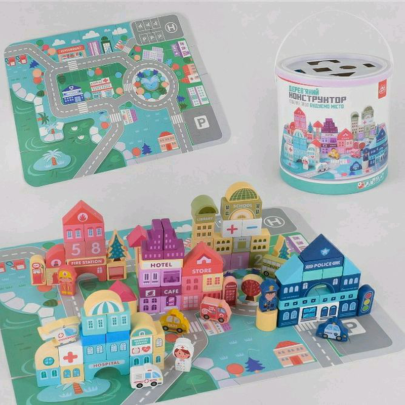 Виробник: Игрушки из дерева Стать: Унісекс Вік: 2 роки Матеріал: Дерев'яні Конструктор підійде як для самих маленьких діток, так і для більш дорослих. Адже для початку в ігровій формі можна вивчити форми і кольору, а пізніше побудувати ціле місто. Чим старше стає дитина, тим складніше і фундаментальніше будуть будівлі з конструктора. Конструктор виготовлений з екологічно чистих матеріалів і абсолютно безпечний для Ваших малюків. Комплектація: - відро-сортер для зберігання конструктора; - 100 різнокольорових фігур різних форм та розмірів; - мішечок для кубиків; - карта-пазл.