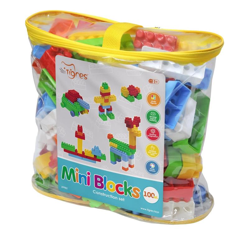 Конструктор "Mini Blocks" 100 ел., Tigres - розвиваюча іграшка для дітей від 1 року. Конструктор - функціональна іграшка, що сприяє розвитку дрібної моторики, фантазії, координації рухів, інтелекту, пам'яті та уваги. Іграшка складається з деталей різної форми. Частина елементів має віськи, на які малюк може одягати колеса, що також входять в набір, й створювати машинки власними руками. З конструктора можна скласти машинку, будинок, гараж, різні фігурки тощо. Цей дитячий конструктор, як і всі пластмасові іграшки Тигрес, не має гострих виступів, що забезпечує максимальну безпеку вашої дитини. Конструктор виготовлений з безпечного матеріалу, відповідає українським та європейським стандартам якості, про що свідчать відповідні знаки на етикетці. Складається з 100 елементів різного розміру і кольорів: Рама - 4 шт (18 см х 3 см х 3 см) Колесо -16 шт Блок 2х6 - 18 шт (9 см х 3 см х 3 см) Блок 2х4 - 36 шт (6 см х 3 см х 3 см) Блок 2х2 - 36 шт (3 см х 3 см х 3 см) Упаковка - поліетиленова сумочка на замку.