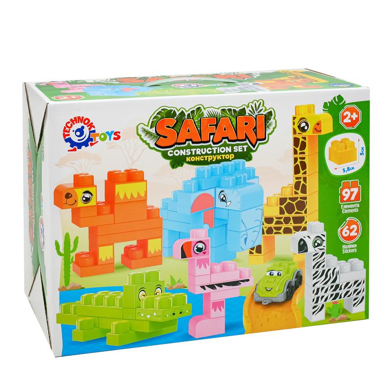 Іграшка "Конструктор Сафарі". 97 деталей та 62 наліпки - зображення тварин. Матеріал - пластик. Паковання — коробка. Розмір - 37х27.5х19.3 см. Вік - від 2 років.