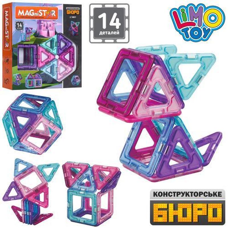 Магнітний конструктор. 14 деталей великого розміру. Матеріал - комбінований. Паковання — коробка. Розмір - 21х5х22 см.