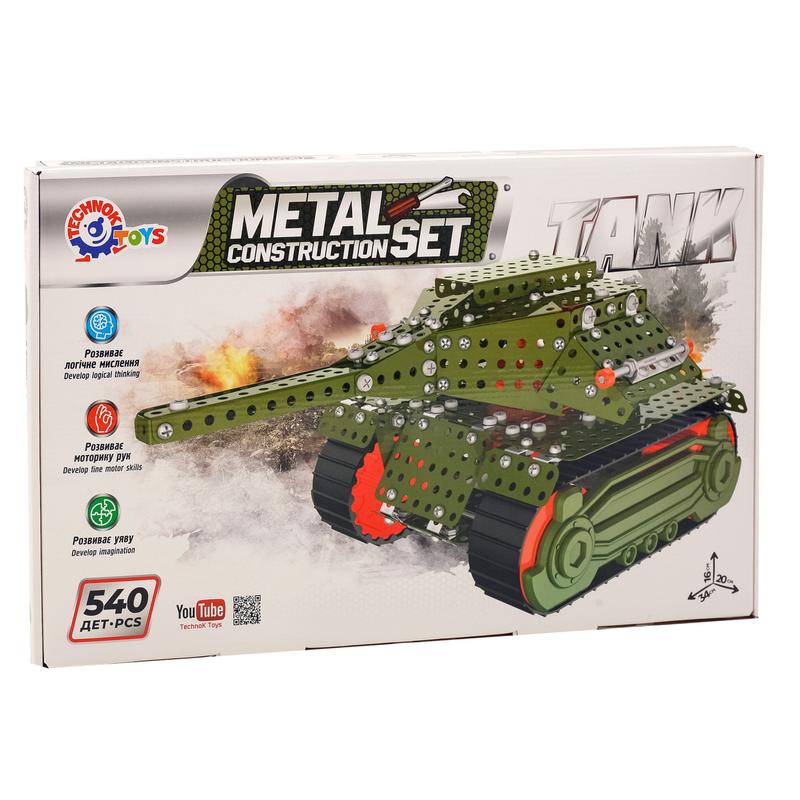 Іграшка "Конструктор металевий". Реалістична модель Танка. Серія - військова техніка. 540 деталей, рухомі гумові гусениці та башта. Матеріал - метал. Упаковка - коробка. Розмір - 49х4.5х30 см. Вік - від 7 років.