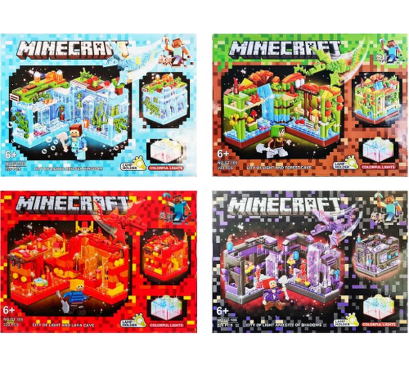 Конструктор Minecraft. 220 деталей, 4 види Різнокольорова підсвітка. Паковання — коробка. Вік - від 6 років.
